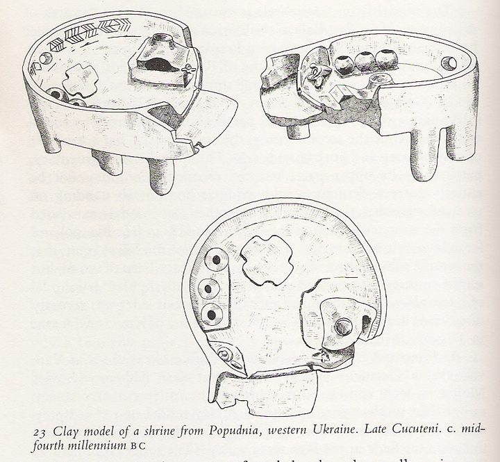 Marija Gimbutas: The Goddesses and Gods of Old Europe. London: Thames and Hudson 1982, 70: Clay model of a shrine from Popudnia, western Ukraine. Late Cucuteni, c. mid-fourth millenium BC.