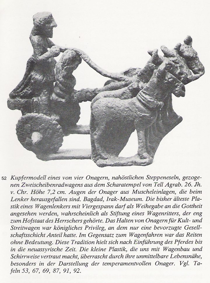 Jean-Claude Margueron: Mesopotamien. Genf: Nagel 1970; München: Heyne paperback 1978, 97: copper model of a chariot pulled by four onager (Asian Wild Ass), 26th century BC, probably a donation of a chevalier at the court, a votive offering to the God.