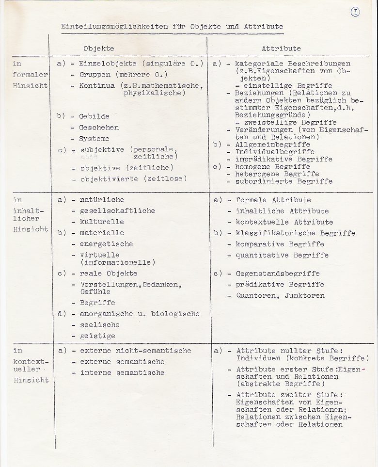 3. in kontextueller Hinsicht a) Gemäss der Vertauschbarkeit von Objekten und Attributen lassen sich - man spricht dann von Attributen zweiter Stufe - auch Eigenschaften von Eigenschaften, Relationen. und Veränderungen, Relationen zwischen Eigenschaften, Relationen und Veränderungen sowie Veränderungen derselben wie auch von Veränderungen selbst bestimmen. b) Eigenschaften und Relationen bezeichnet man als Attribute erster Stufe. c) Aus Gründen einer stufentheoretischen Zweckmässigkeit werden die Objekte als Individuen gefasst und ebenfalls als Attribute, und zwar ureigentliche Attribute oder Attribute nuller Stufe bezeichnet.