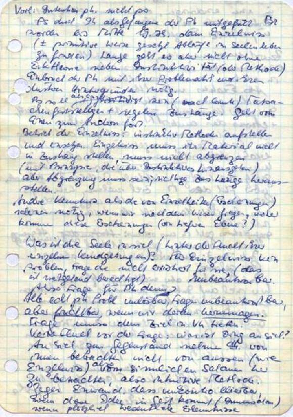 Was ist die Seele in sich, hinter der Flucht ihrer einzelnen Kundgebungen? Diese Frage existiert für die Einzelwissenschaft nicht; das ist weitgehend berechtigt. Diese Frage ist unbeantwortbar, also eine Frage für die Philosophie – denn alle echten philosophischen Probleme sind unlösbar, die Fragen unbeantwortbar, aber fruchtbar, wenn wir daran herumnagen. Also keine Flucht vor der Frage: Was ist das Ding an sich? Wir müssen das An sich zum Gegenstand nehmen, das heisst von innen betrachten, nicht von aussen (wie die Einzelwissenschaft), also vom sinnlichen Schauen her, also intuitive Methode.