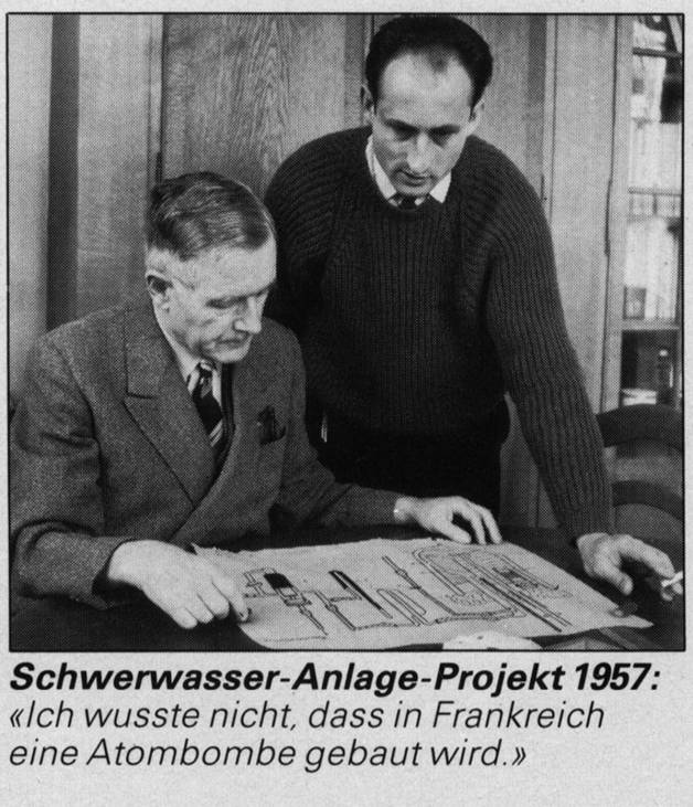Thürkauf: Im Auftrag der Firma Sulzer ging ich im Jahre 1959 nach Frankreich, wo ich zusammen mit andern Forscherkollegen Schweres Wasser herstellte. An allen Plakatwänden prangte damals der von der Regierung Eisenhower und der Uno verbreitete Slogan «Atomes pour la paix». Ich selbst war von diesem Slogan überzeugt. Doch 1959 war das Jahr, in dem der französische Staatspräsident de Gaulle seine Atommacht begründete, indem er in der damals noch französischen Sahara die erste Atombombe zündete. Es war eine Plutoniumbombe, und das Plutonium stammte aus einem Schwerwasserreaktor, dessen Schweres Wasser ich herzustellen geholfen habe.